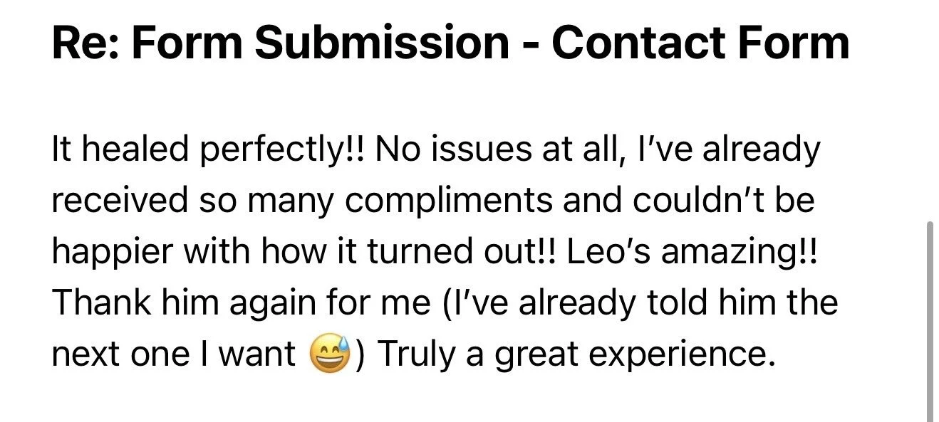 WHAT CLIENTS ARE SAYING BOOK YOUR TATTOO WITH LEOInterested in getting something? Please fill out the form bellow with as much detail as possible about your tattoo concept. This is only an inquiry, and once reviewed we will reach out to discuss your design, provide a quote, and schedule your appointment if the project is accepted.